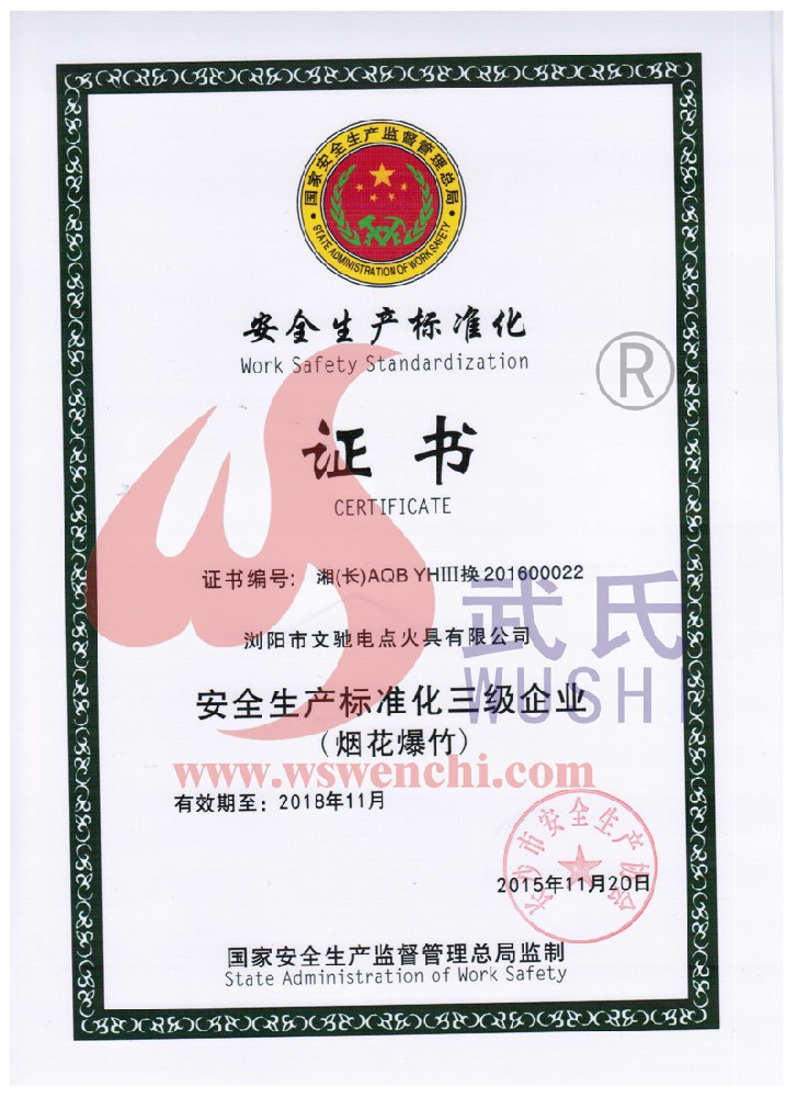 瀏陽市文馳電點火具有限公司(原培文電子點火器材廠),創建于1998年,是一家專業從事研制銷售電子點火產品的民營科技企業,是我國第1枚煙花用電點火頭生產者,是《煙花爆竹電點火頭國標》牽頭起草單位。公司位于中國“煙花之鄉”湖南省瀏陽市,地理位置優越,交通便利?! ? 我公司研制的對象是用電能引燃火藥、做機械功等預定功能的一次性使用的元件或裝置,包括電點火頭(英文名ElectricMatch or Electric Igniter,中文俗稱“電火柴”或“電發火頭”)、電點火管和延期電點火管;我們估且在以后的產品技術欄中將我們研究的產品統稱為電點火具,將電點火器看成是用于提供和控制供給電點火元件點火的電能器材;我們研究的電點火橋路有橋絲式、無橋絲···